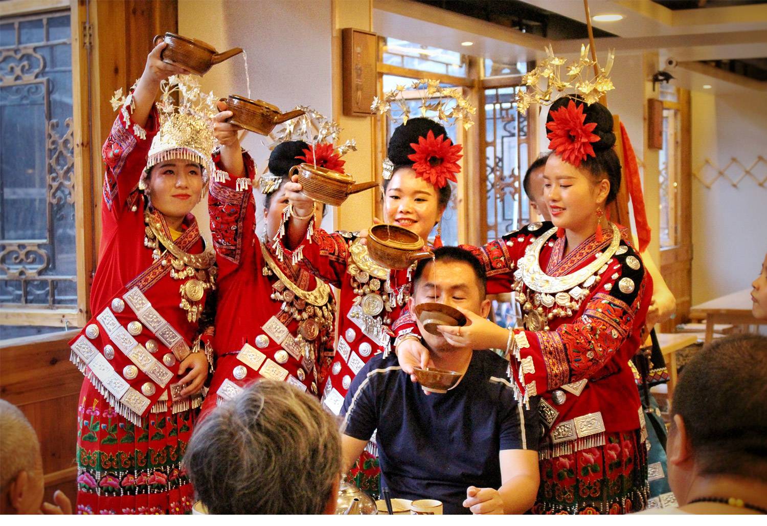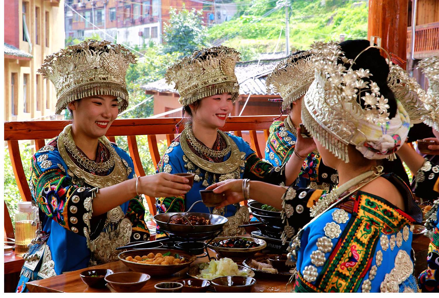 - 美食風味 : 砂鍋魚風味/南跳菜彝族風味/納西銅火鍋 /黃果樹風味/貴陽烤魚/烤雞風味;特別安排:貴州千戶苗寨苗族酸湯魚高山流水長桌宴風味!
